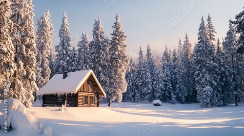 Naklejka premium A peaceful winter scene with snow-covered trees and a cozy cabin, embodying...