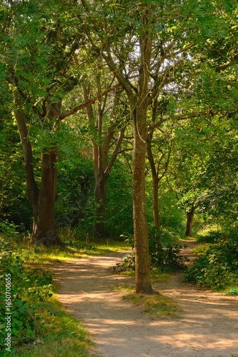 Fototapeta premium A peaceful woodland path surrounded by tall trees and lush greenery, with sunlight filtering through the leaves and casting shadows on the trail.