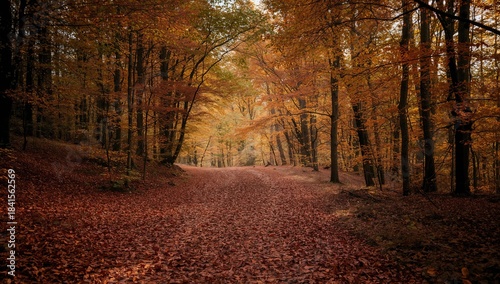Obraz premium A peaceful woodland pathway bathed in sunlight, covered with colorful autumn foliage, suitable for landscape backgrounds