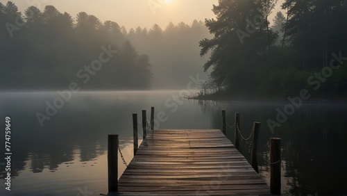© Shahzaib, Fototapeta premium A peacefully aging wooden dock emerges from the mist-shrouded lake at the break of dawn. Its weathered planks exude a quiet charm, surrounded by the hazy light of early morning. This evocative scene.