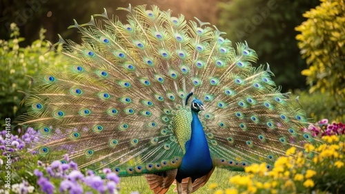 Obraz premium A peacock displays its vibrant tail feathers in a lush garden