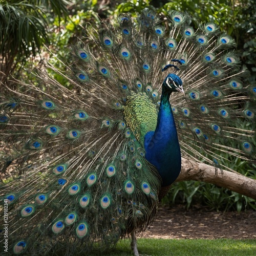 © Usman, Naklejka premium A peacock fanning its iridescent tail in a serene garden filled with exotic plants.