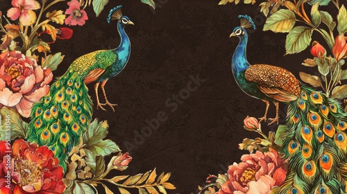 © Zaleman, Naklejka premium A peacock frame with watercolor flowers against a black background