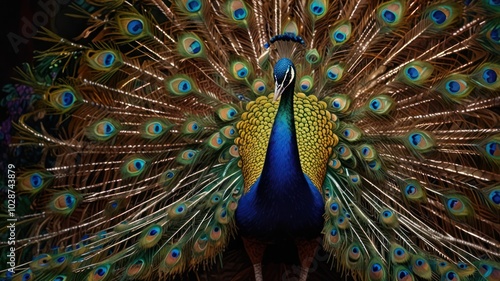 Obraz premium A peacock stands in the middle of a vibrant garden, its colorful feathers gleaming in the sunlight. Its graceful neck arches as it moves among the flowers, and its tail feathers fan out beautifully.