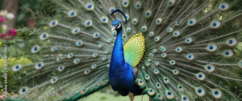 © LiaSyafitri, Fototapeta premium A peacocks regal display of plumage iridescent beauty in full bloom