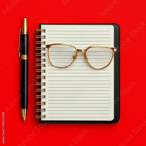 © MetaKibo, Fototapeta premium A pen, glasses, and a notebook on a vibrant red background.