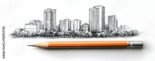 © Pumapala, Fototapeta premium A pencil sketch of a city skyline with a pencil in the foreground.