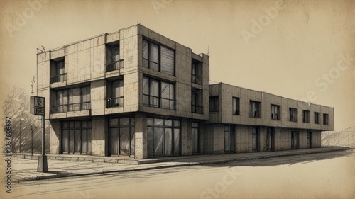 Obraz premium A pencil sketch of a modern concrete building with large windows.