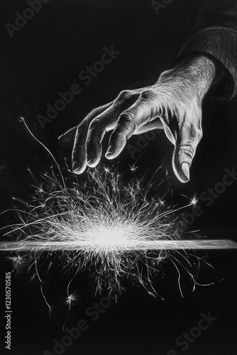 © Natalia, Fototapeta premium A pencil sketch of an iconic static electricity scene, depicting a realistic hand reaching toward an intense burst of electric sparks against a dramatic dark background
