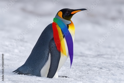 Fototapeta premium A penguin adorned with a colorful scarf stands out against the pristine snow,...