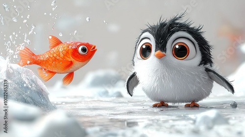 © Anna, Fototapeta premium A penguin and a goldfish face each other in the water, observing one another