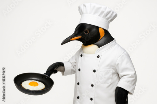 © Andbiz, Fototapeta premium A penguin chef in a white jacket with scrambled eggs in a pan.