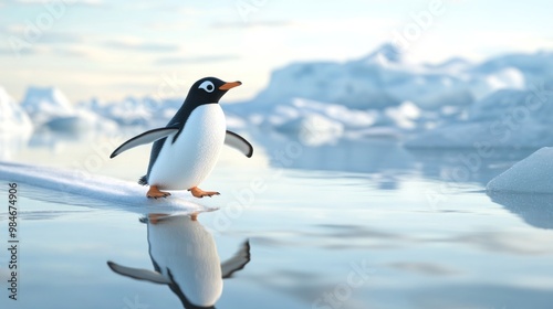 © BerkahStock, Naklejka premium A penguin glides across icy waters, surrounded by floating icebergs in a serene environment.