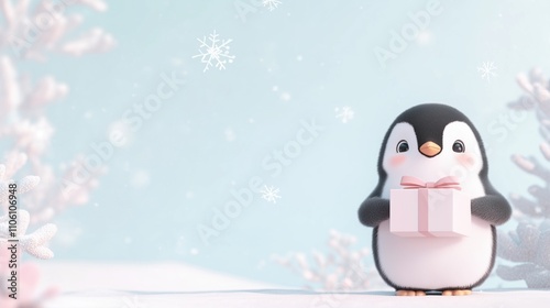 © Nata, Naklejka premium A penguin is standing in the snow with a pink box in front of it. The image has a cute and playful mood, and it could be a representation of the joy