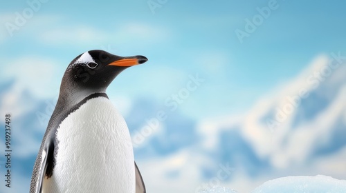 Fototapeta premium A penguin is standing on a snowy mountain