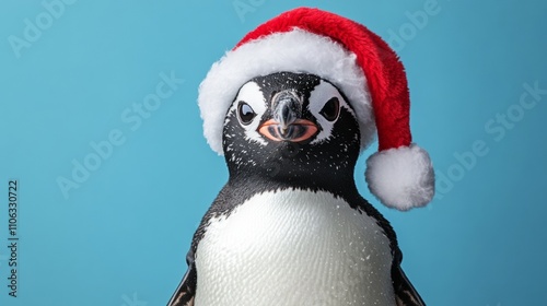 © Vitalii Shkurko, Naklejka premium A penguin sports a cheerful Santa hat, bringing a festive spirit. With a bright blue background, this playful moment embodies the joy of the holiday season. With copy space for text