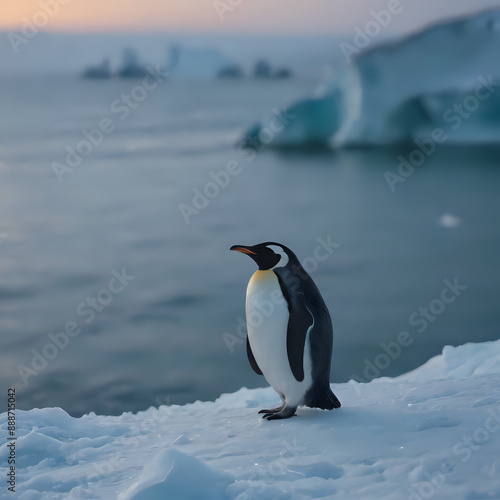 © Masum, Fototapeta premium a penguin standing on the snow by the water