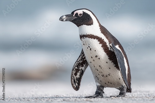 Fototapeta premium A penguin standing upright on a beach with its side profile