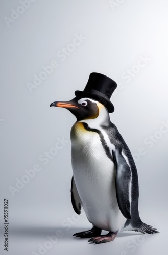 © Bang AI, Fototapeta premium A penguin wearing a top hat, posed elegantly against a minimalistic background.