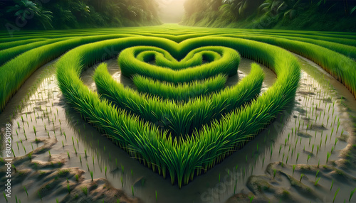 Fototapeta premium A people working in a vibrant green rice field under a warm, glowing sunset....