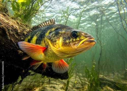 Naklejka premium A perch swims gracefully among aquatic plants in a river, showcasing its...