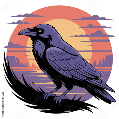 © Jude, Obraz premium A perched crow with an enchanting view of the sunset