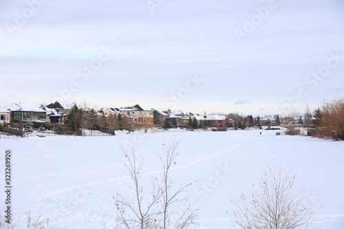 Obraz premium A Perfect Neighborhood along a Frozen River in Canada.