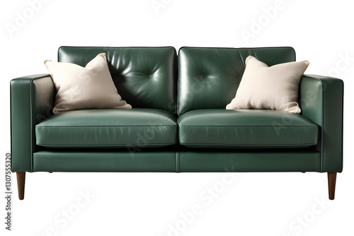 © Samoresh, Obraz premium A perfectly centered, front-facing view of a modern two-seater caramel-green leather sofa