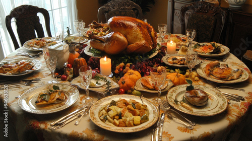 Naklejka premium A perfectly roasted turkey centerpiece on a festive table, surrounded by...