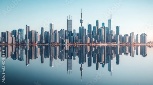 © peerawat, Naklejka premium A perfectly symmetrical reflection photo of a city skyline on water