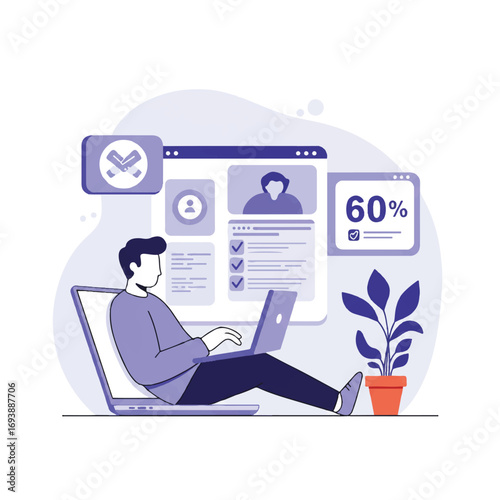 © andri, Obraz premium A person comfortably uses a laptop at home to access online public services, showcasing a user-friendly interface on the screen, depicted in a clean 2D flat vector illustration.