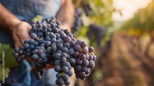 © svastix, Obraz premium A person displays a tight cluster of deep purple grapes in a lush vineyard, illustrating the fruitful and meticulous nature of agricultural practices in preserving quality.