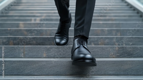 © pvl0707, Naklejka premium A person dressed in professional business attire gracefully descends a modern staircase, surrounded by an urban environment on a sunny day
