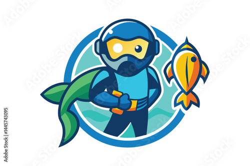 © Tanu, Naklejka premium A person dressed in scuba diving gear gives a thumbs up while surrounded by water, accompanied by a colorful fish, highlighting underwater exploration and marine adventure.