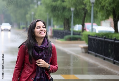 © Playgrow19, Fototapeta premium A person enjoying a walk in the rain smiling