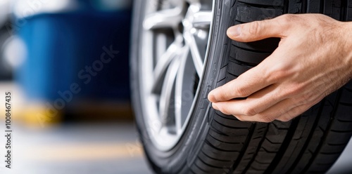 © Natawut, Obraz premium A person examines a car tire, checking its condition in a garage setting, highlighting vehicle maintenance and safety.