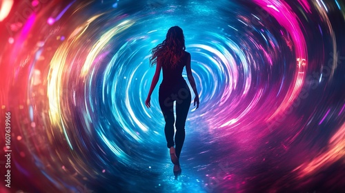 Naklejka premium A person explores a glowing tunnel of light and energy in a futuristic...