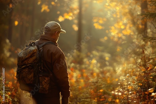 © Fotograf, Fototapeta premium A person hiking through dense woods, carrying a backpack