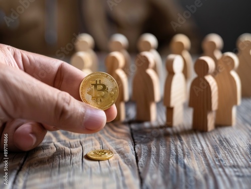 © Alexander Chaykin, Fototapeta premium A person holding a bitcoin in front of a group, useful for financial or tech-related concepts