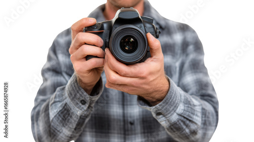 Obraz premium A person holding a camera, ready to capture moments, isolated on a white background.