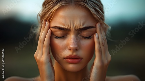 Fototapeta premium A person holding their head with a pained expression, symbolizing headaches,...