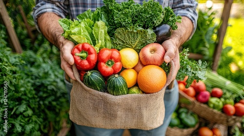 © weerasak, Fototapeta premium A person holds a basket filled with fresh, colorful vegetables and fruits, showcasing vibrant produce in a natural setting.