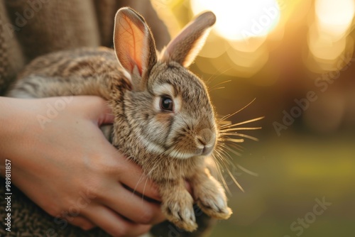 © InfiniteStudio, Fototapeta premium A person holds a domestic rabbit gently in soft lighting with a blurred background during golden hour