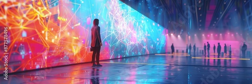 © Nima, Fototapeta premium A Person in a Futuristic Setting - A person standing in a futuristic setting, surrounded by a vibrant and abstract digital display. - A person standing in a futuristic setting, surrounded by a vibrant