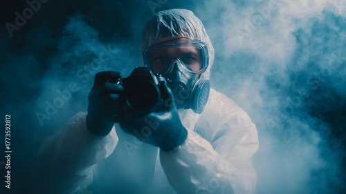 Fototapeta premium A person in a protective suit and gas mask holds a surrounded by dense blue...