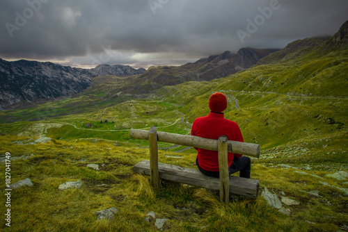 © Igor, Naklejka premium A person in a red jacket sits on a wooden bench overlooking a dramatic mountain landscape under dark, moody clouds.