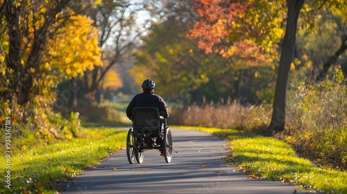 © Athena, Fototapeta premium A person in a wheelchair enjoys a scenic autumn path surrounded by colorful trees and foliage.