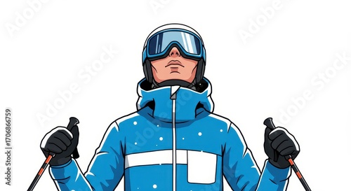 © Ariestia, Naklejka premium A person in blue ski attire, holding ski poles, gazes upwards against a pure white background.