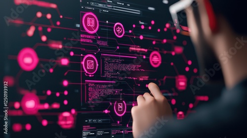 © happysunstock, Obraz premium A person interacts with a digital interface displaying vibrant pink data visuals, highlighting technology and programming elements.