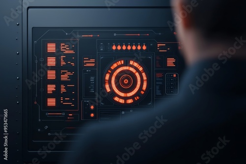 © Jenjira, Obraz premium A person interacts with a high-tech interface showcasing a digital dashboard with vibrant orange graphics.